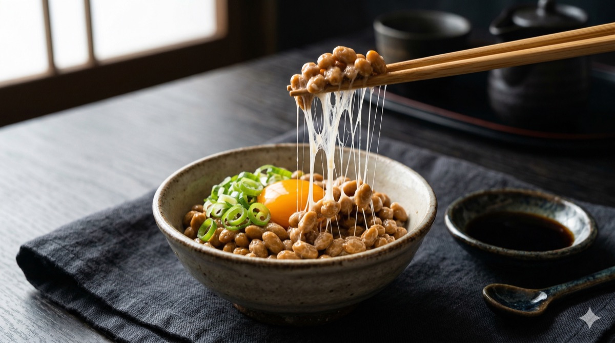 Temperature note: natto is served straight from the fridge over hot rice. Do not warm the natto separately — heat above 70°C destroys nattokinase and breaks down the strings.